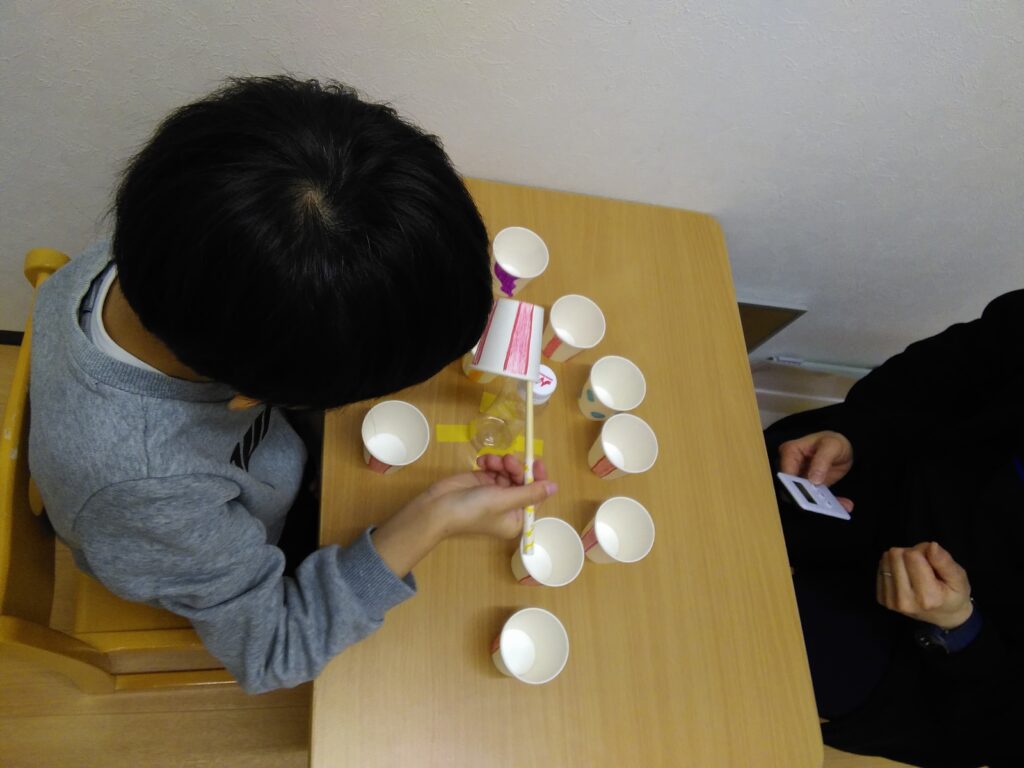 お箸ですくった紙コップを落とさないように手首を固定して被せていくことが出来ました。