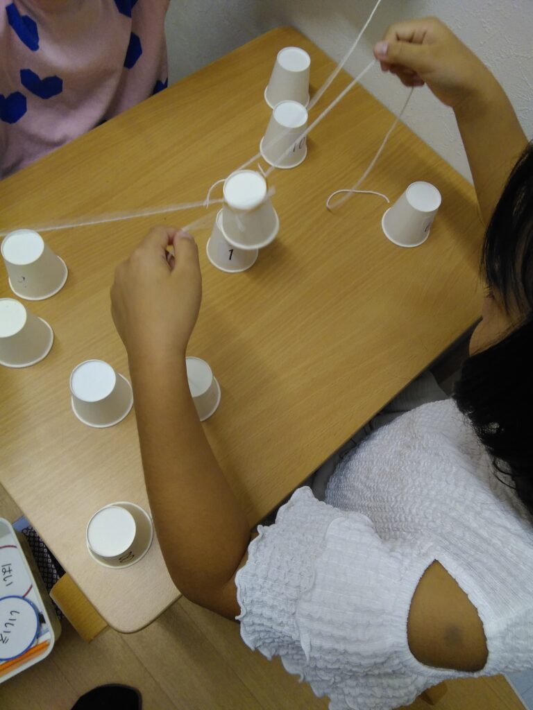 輪ゴムと紐を組み合わせた教具を使用してお友だちと協力で1~10の数字が書かれた紙コップを重ねていきます。
