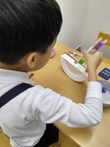 子どもたちは何色を持つか、何色の上を跳ぶかなどを目で確認をしながら、前屈みになりすぎないように意識をして取り組みました。