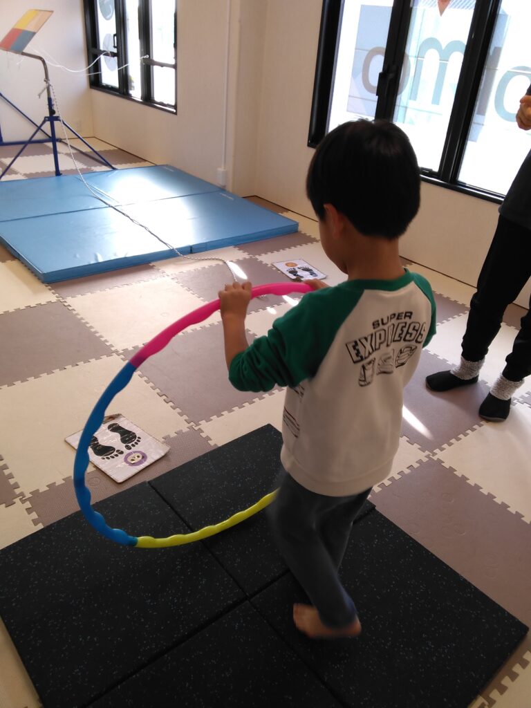 この種目では、縄跳びの導入として身体の前でフラフープを持ち、手首の使い方や、ジャンプをするタイミングを掴む練習を行っていきました。