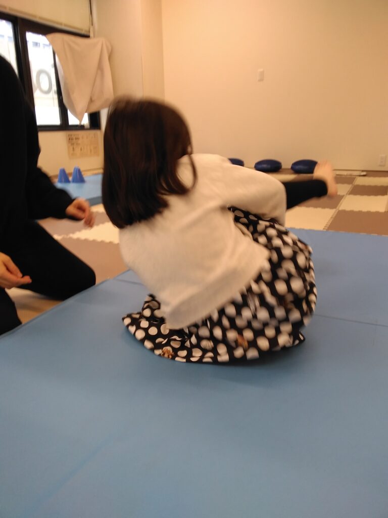 マット種目の「起き上がりこぼし(ゆりかご)」に取り組んでいる様子です。