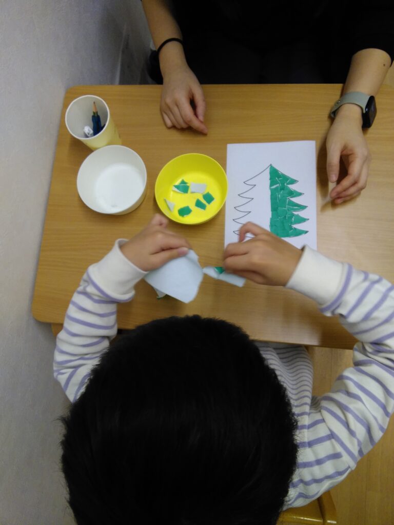 また、本日はクリスマスツリーを作成する季節感のあるプログラムを行いました。