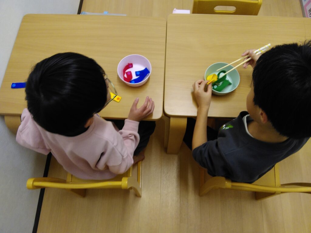 お箸でスナップバンドをお友だちのお皿に置き、お友だちはスナップバンドをくっつけていきます。