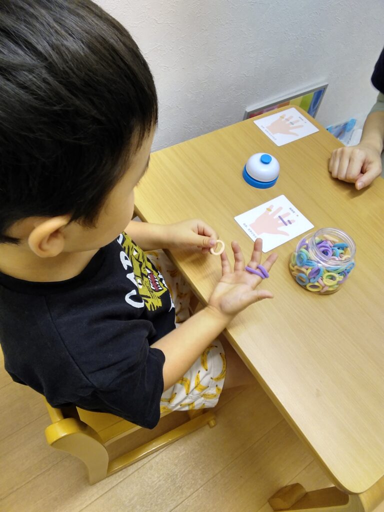 また、平面の指示カードを見て立体の指に色ゴムをかけることで、想像力や空間認識力を鍛えることが出来ます。