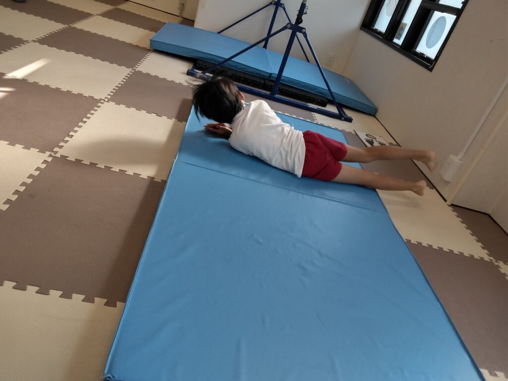 マットの「えんぴつ転がり」に取り組んでいる様子です。