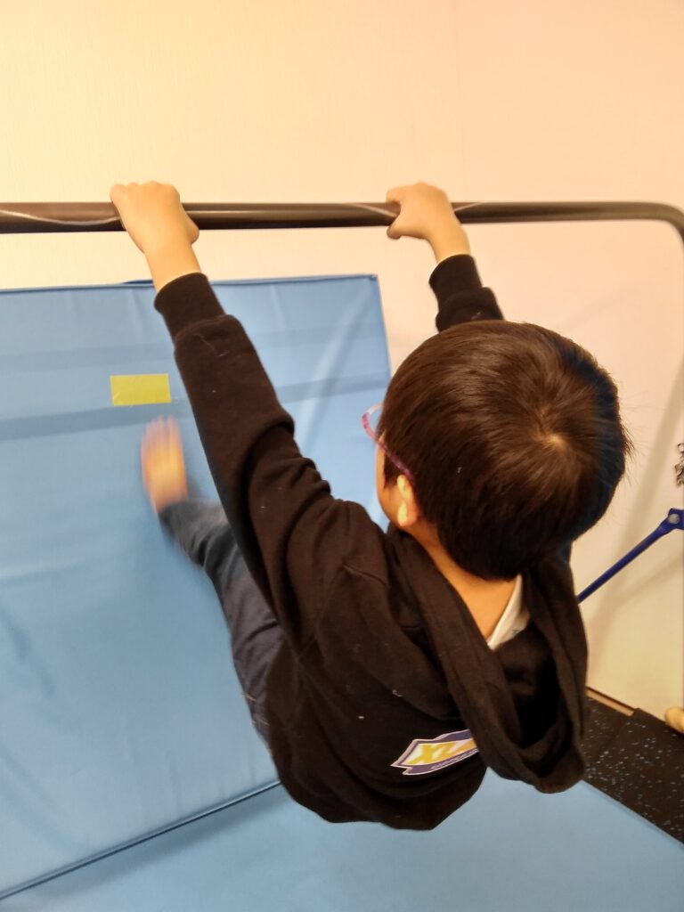 壁蹴り逆上がりのねらいは、身体を引き付ける力と支える力、回転感覚、足の蹴り上げる感覚の習得になります。