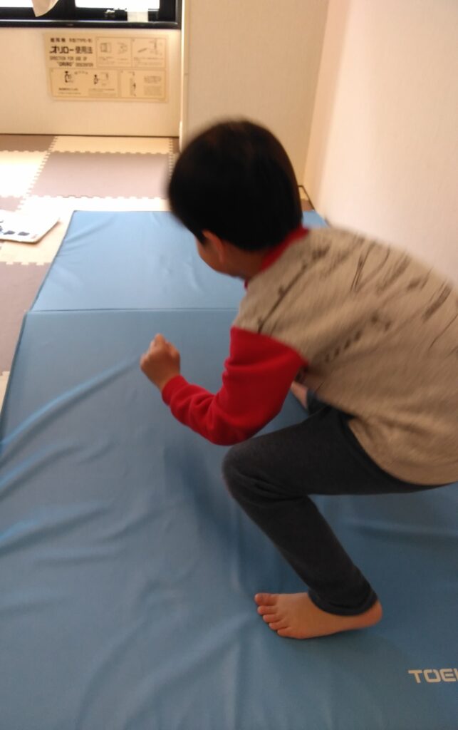 蹲踞歩きの姿勢の取り組んでいる様子です。
