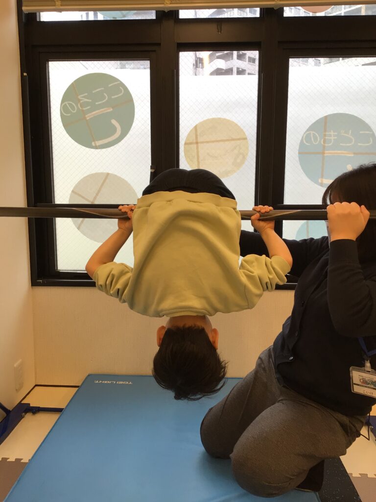 布団干しの姿勢に慣れている子は鉄棒から両手や片手を離してじゃんけんに挑戦しています。