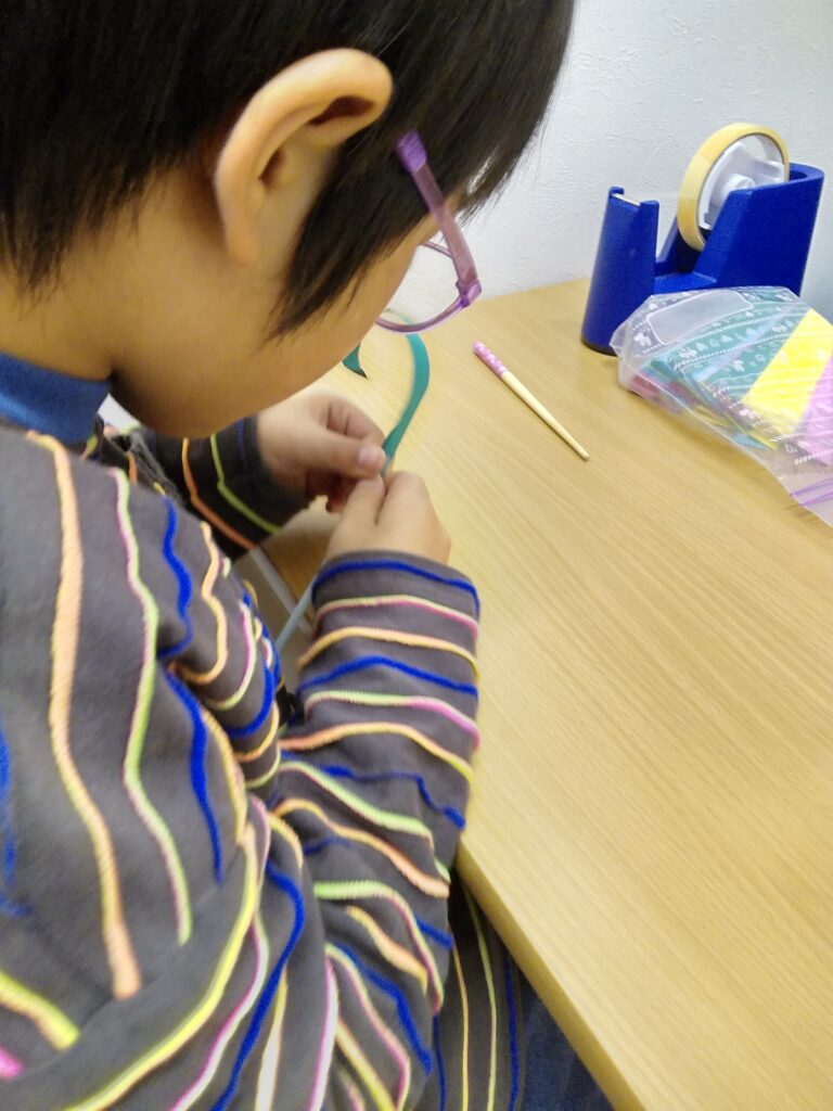 細長く切った画用紙の先端を箸を使ってクルクルと巻いていきます。