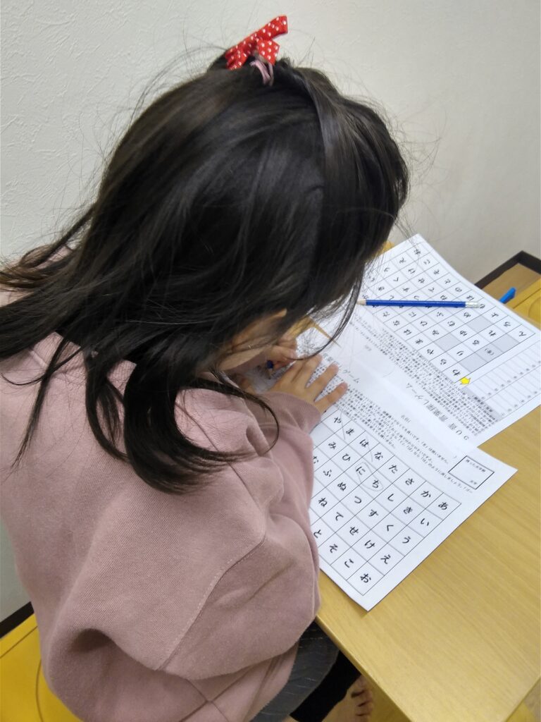 ひらがな50音言葉探しゲームに取り組んでいる様子です。