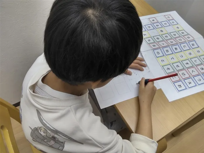 3文字から4文字伝えた後に、再度1文字目から探したひらがなを思い出しながらマス目に書いていきます。
